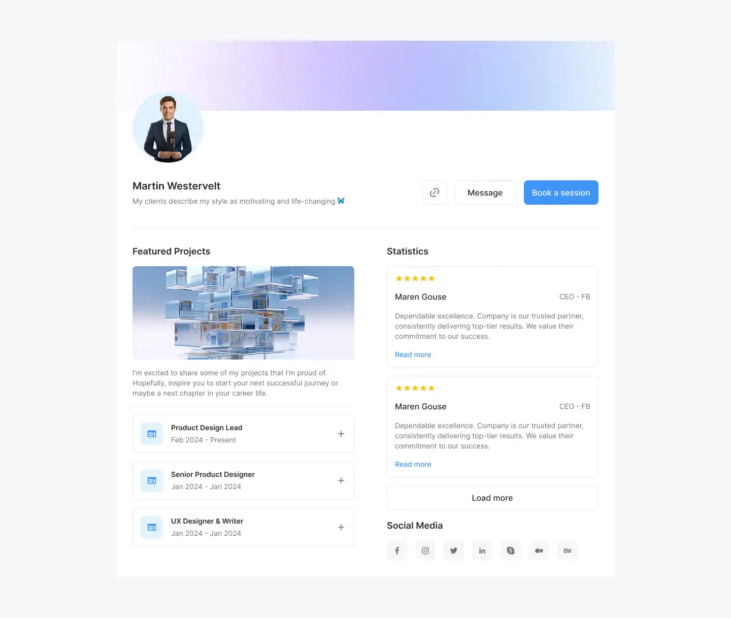 Show project results and stories in a professional way. Includes visual storytelling, stats, and client quotes.
