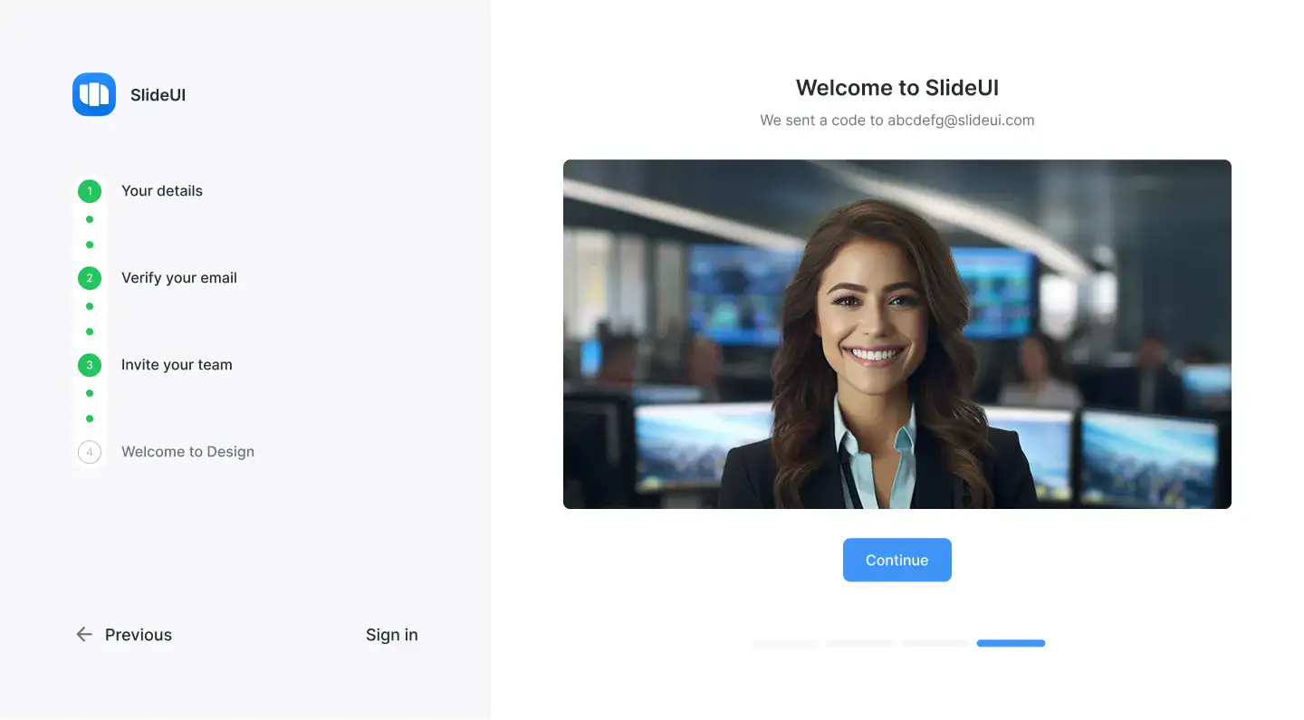 Multi-step flows for onboarding, signups, or product tours. Includes visual progress indicators.
