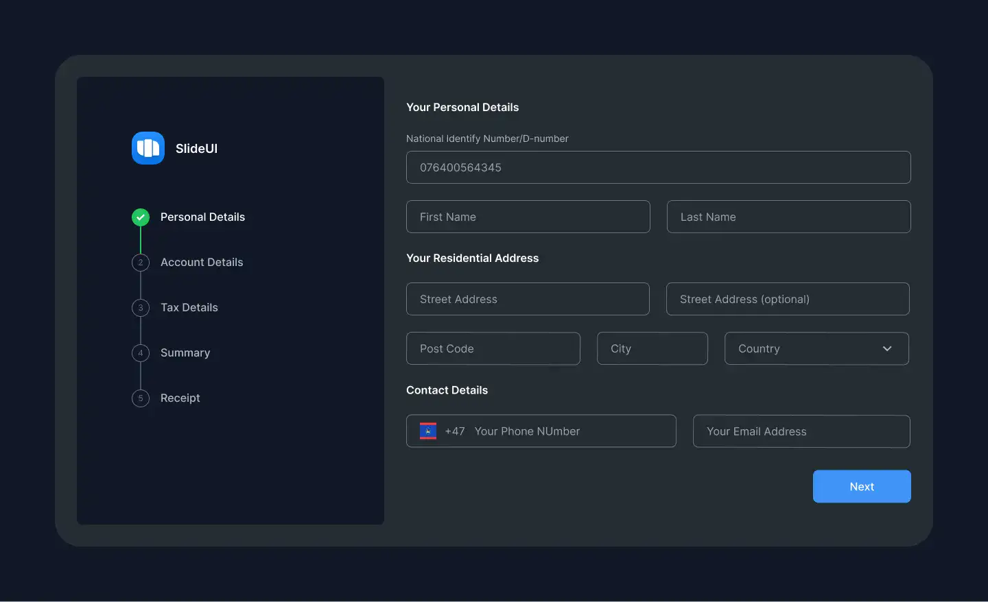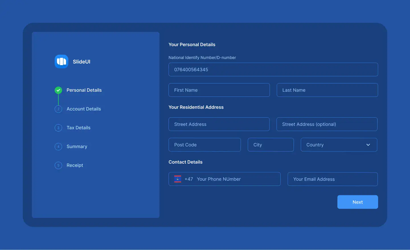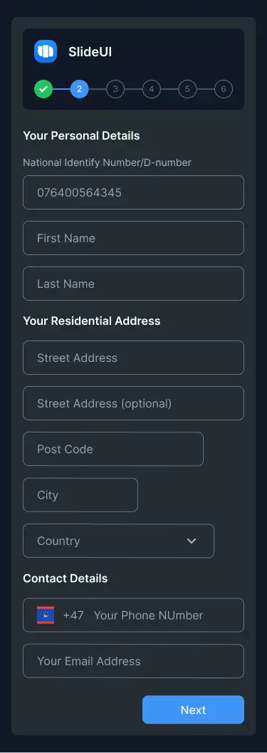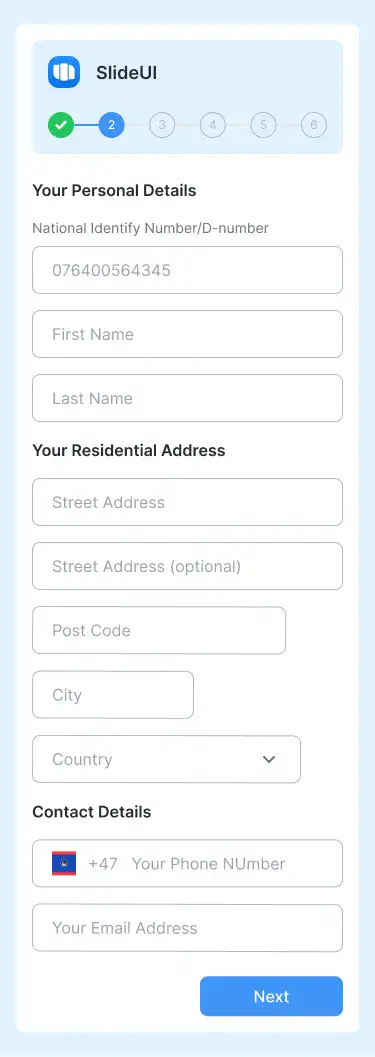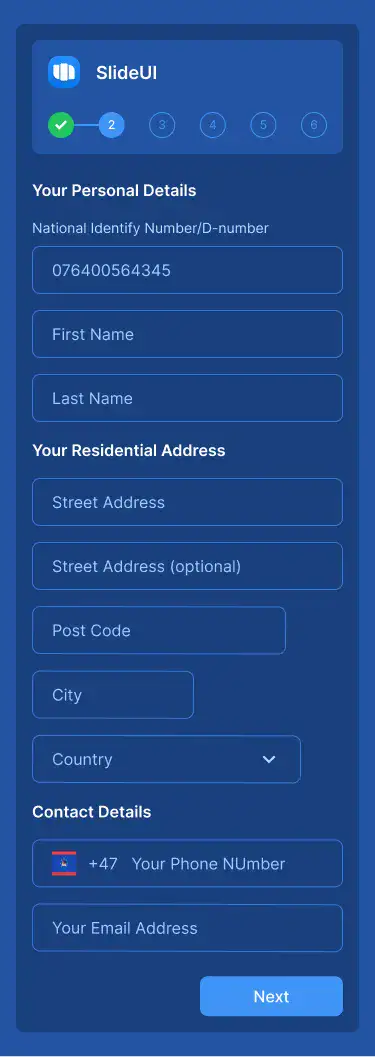 Registration Progress Steps Layout for Figma — swiss, themeable and responsive across Desktop, Tablet and Mobile. Includes Light, Dark and Accent modes for fast customisation. Ideal for Fitness, Insurance, Job Board.