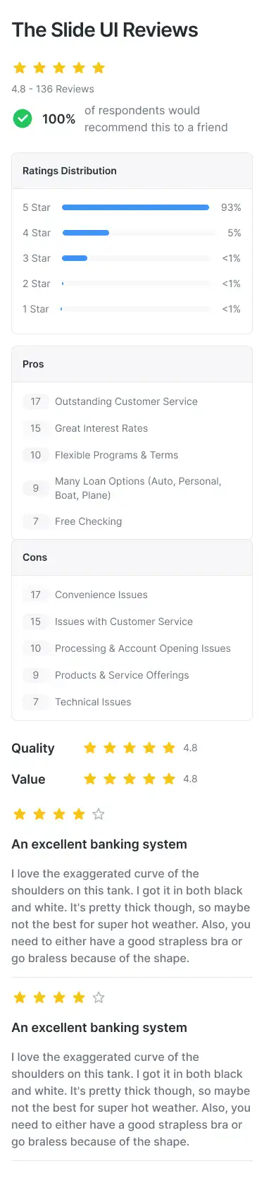 Trust-building review blocks that show user feedback, star ratings, or real testimonials with proof elements.