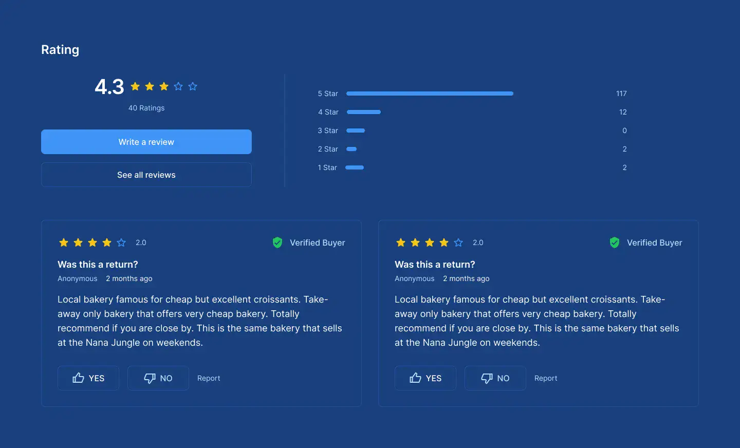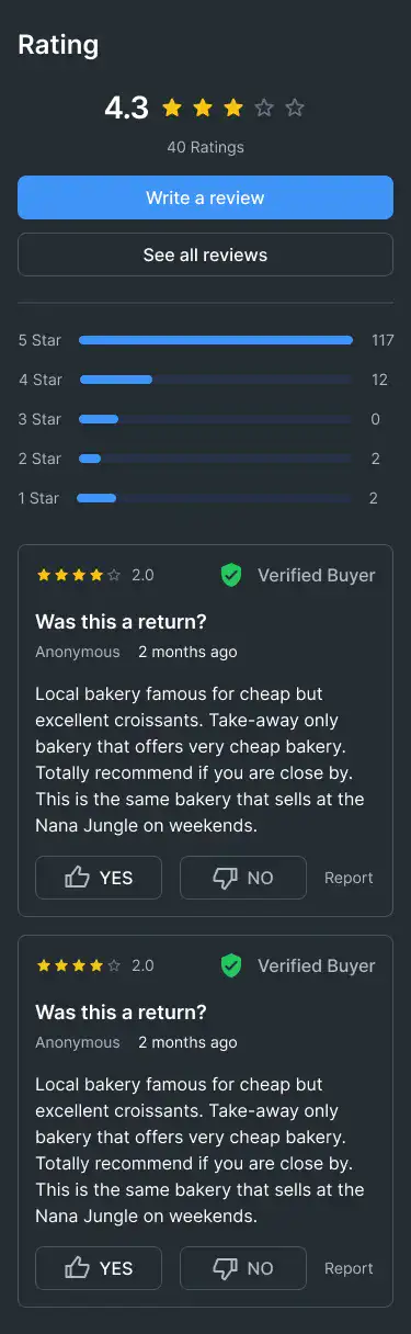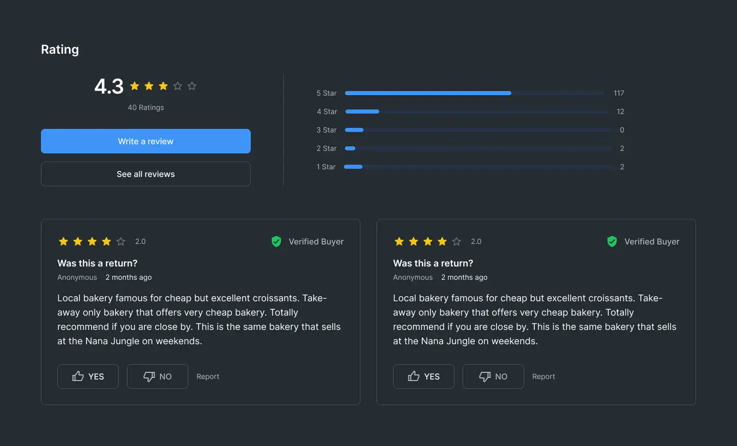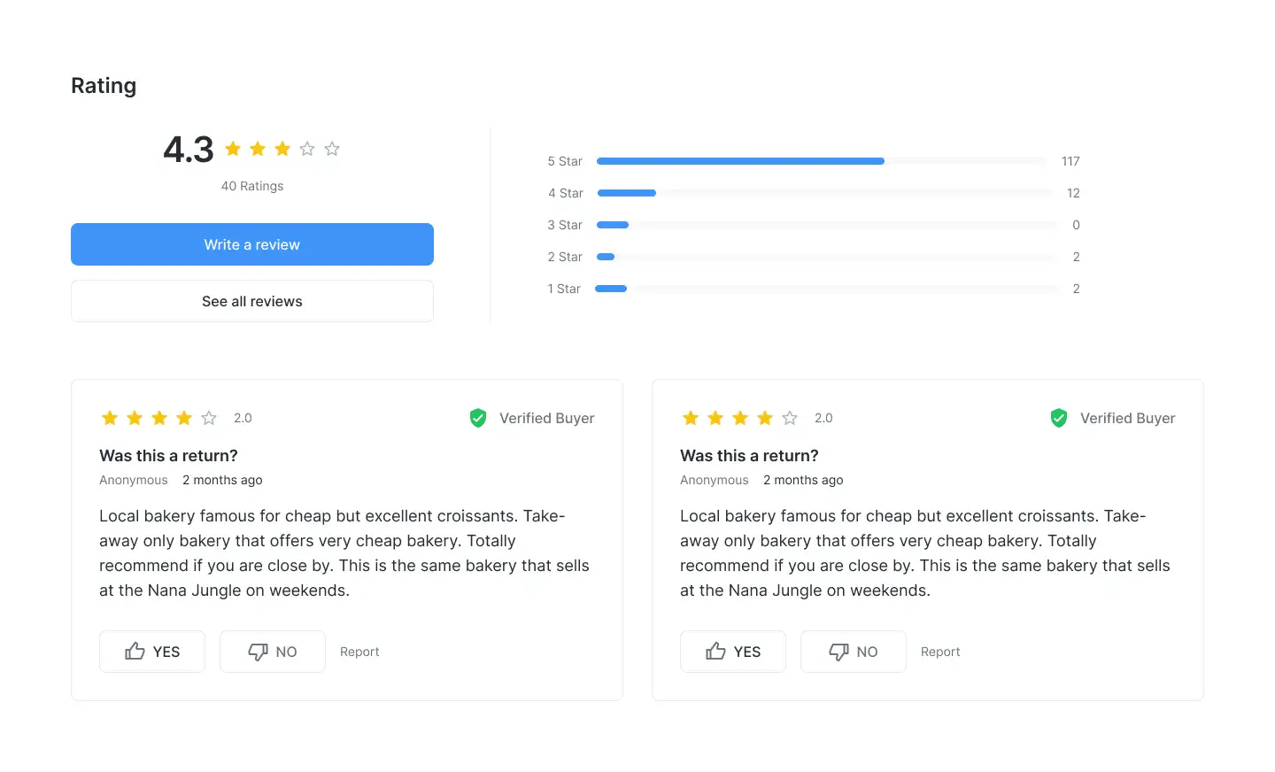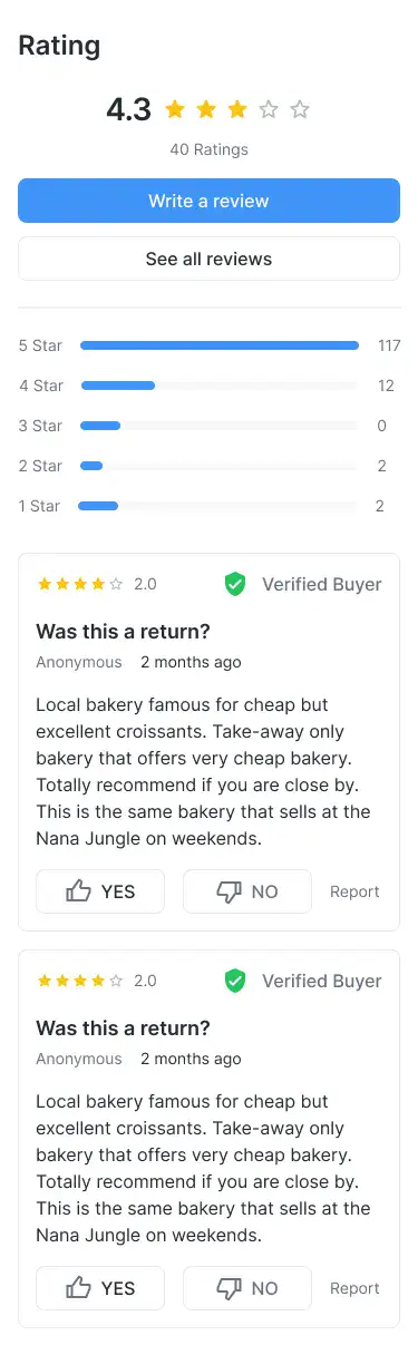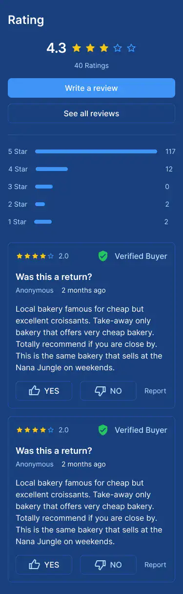 Trust-building review blocks that show user feedback, star ratings, or real testimonials with proof elements.