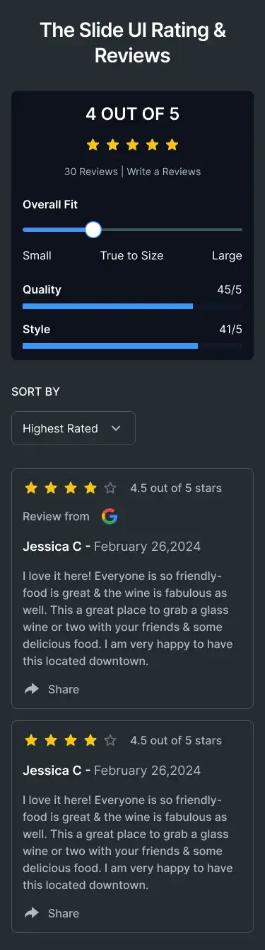 Trust-building review blocks that show user feedback, star ratings, or real testimonials with proof elements.