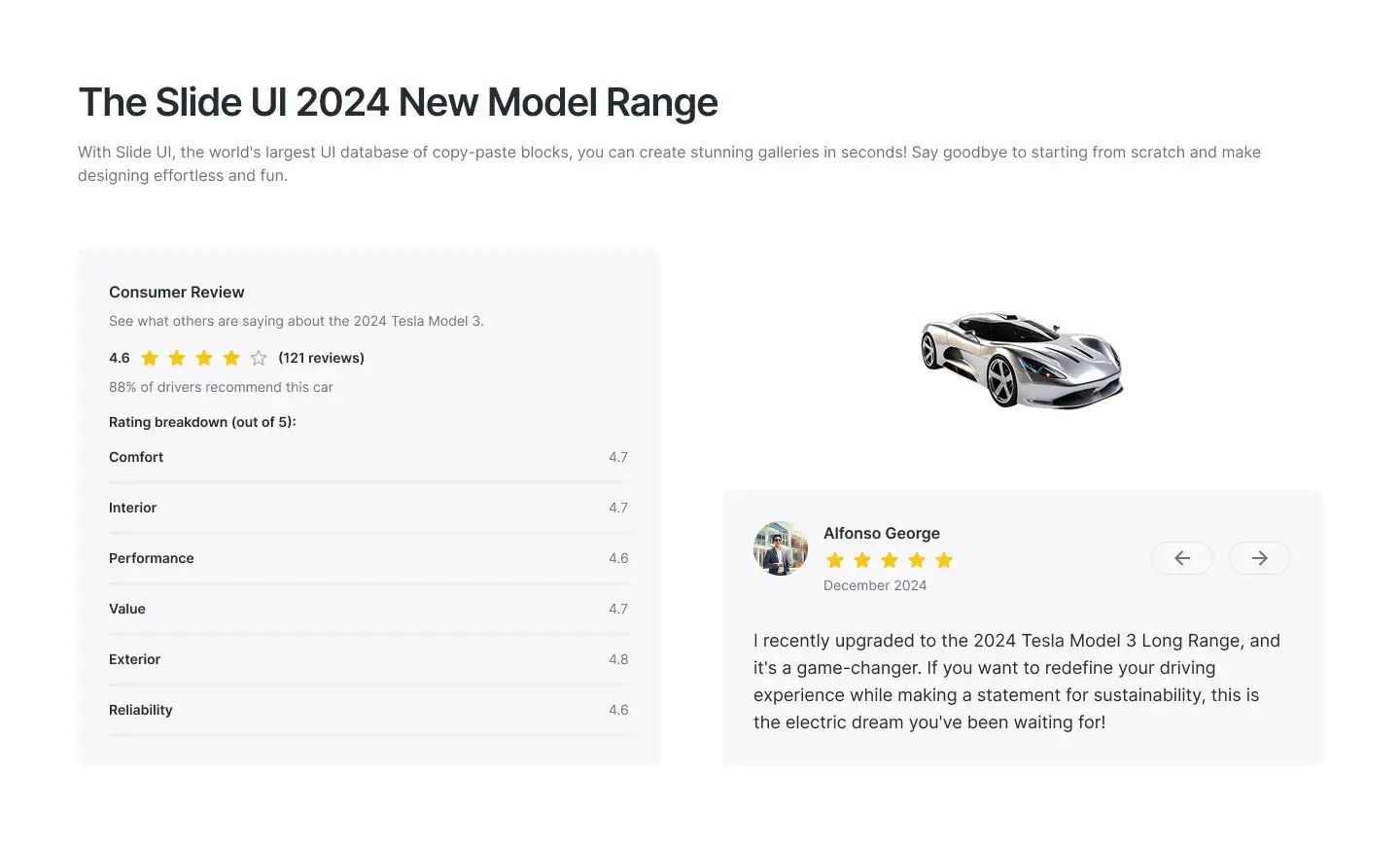 Trust-building review blocks that show user feedback, star ratings, or real testimonials with proof elements.