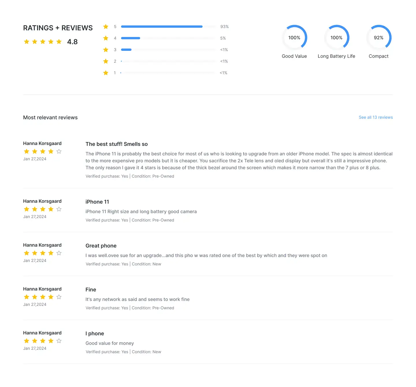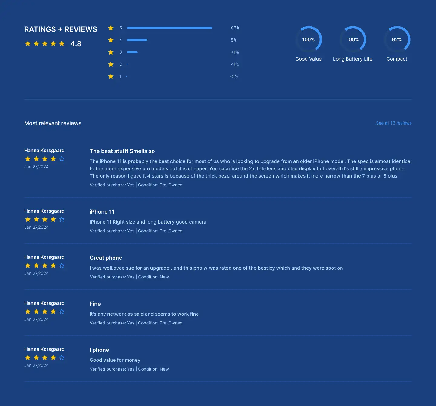 Trust-building review blocks that show user feedback, star ratings, or real testimonials with proof elements.