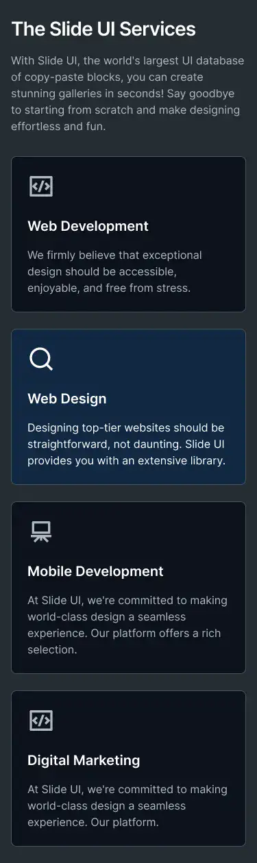 Grid or column-based layouts to highlight your best product features — fast, skimmable, and easy to reuse.