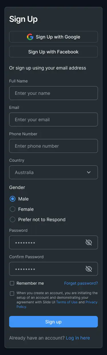 Sign Up Layout for Figma — clean, themeable and responsive across Desktop, Tablet and Mobile. Includes Light, Dark and Accent modes for fast customisation. Ideal for Automotive, Events, Media.