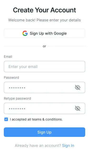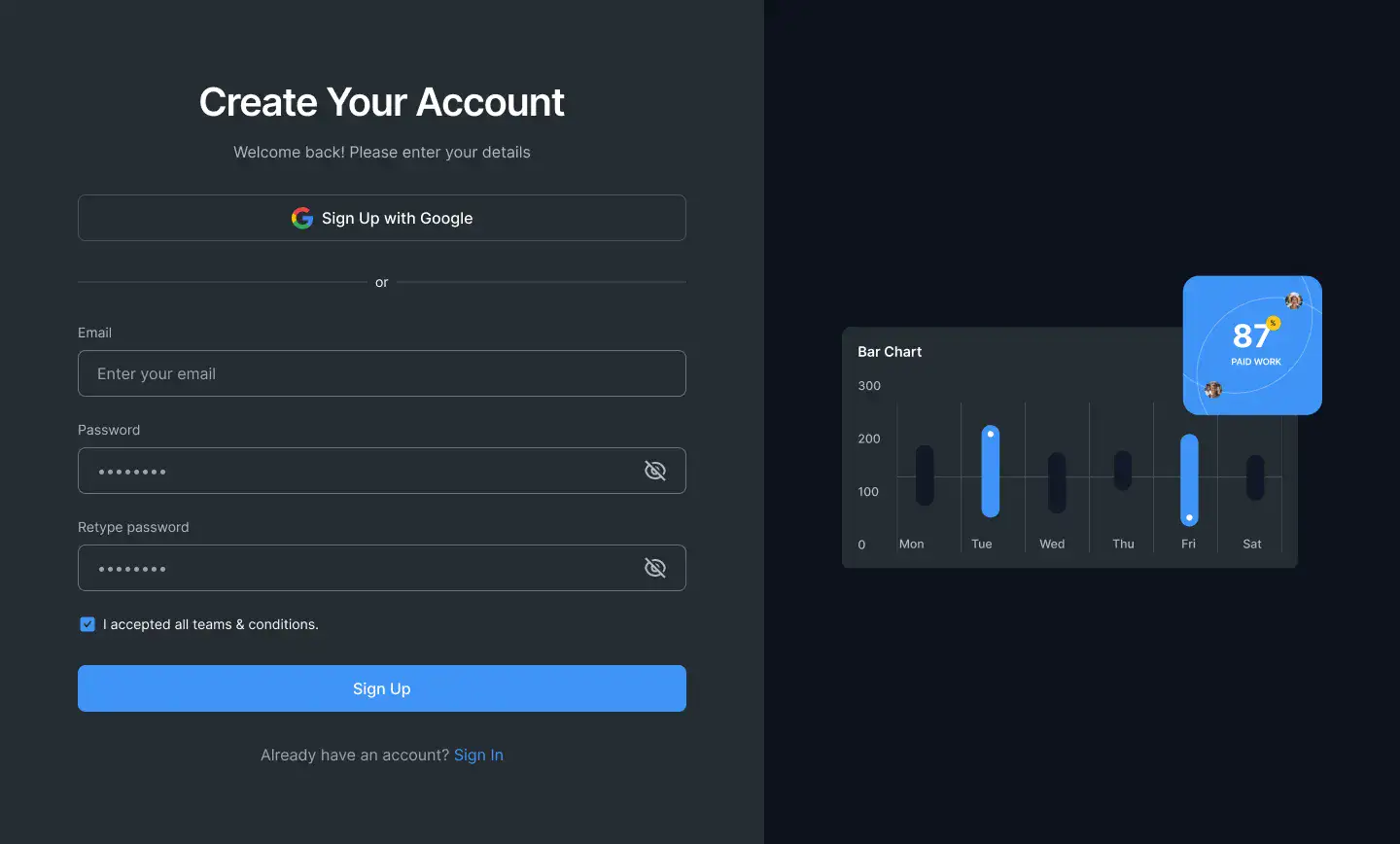 Sign Up Layout for Figma — minimal, themeable and responsive across Desktop, Tablet and Mobile. Includes Light, Dark and Accent modes for fast customisation. Ideal for Fintech, Healthcare, Hotel.