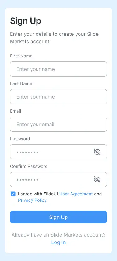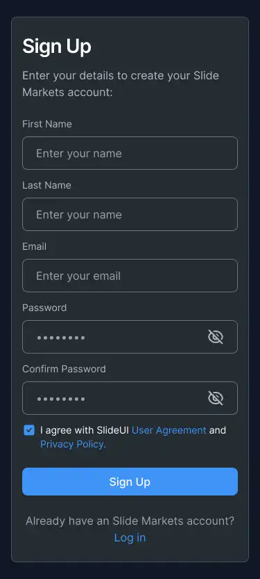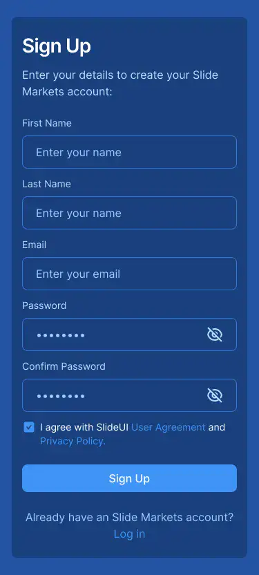 Sign Up Layout for Figma — modern, themeable and responsive across Desktop, Tablet and Mobile. Includes Light, Dark and Accent modes for fast customisation. Ideal for Ecommerce, Finance, Job Board.