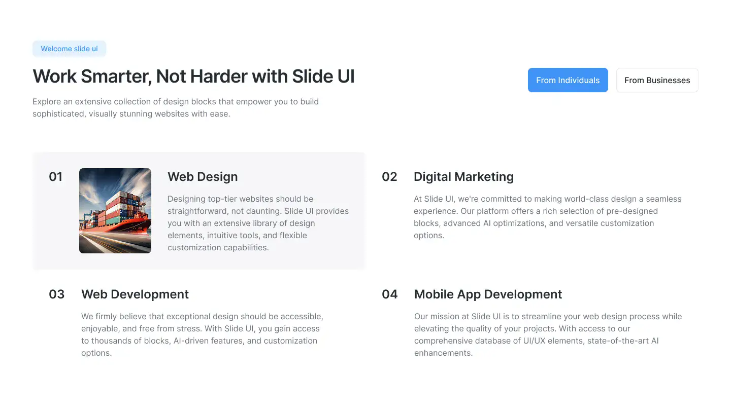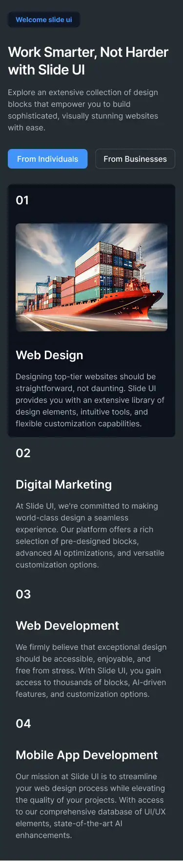 Lightweight sections for storytelling, intros, or visual breaks. Ideal for portfolios, agencies, and SaaS.