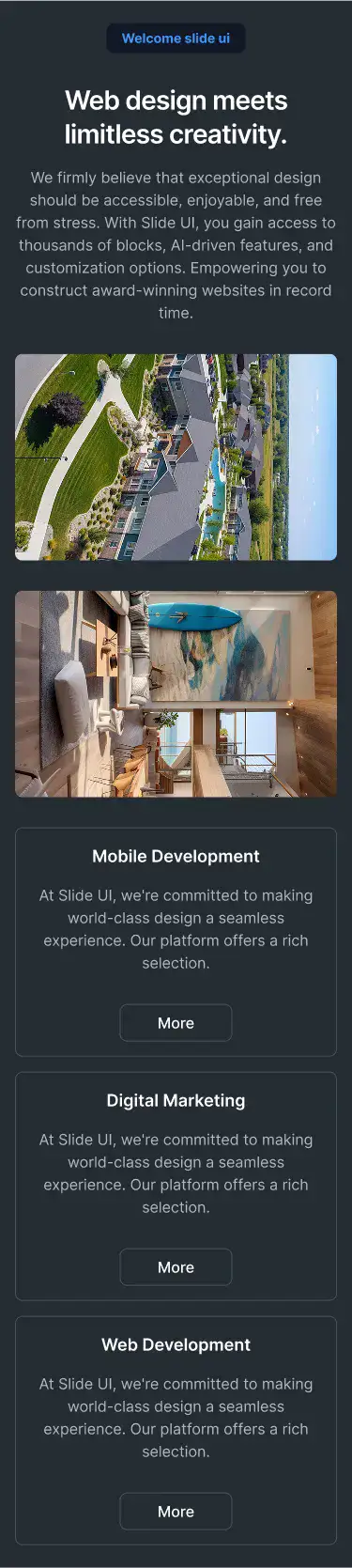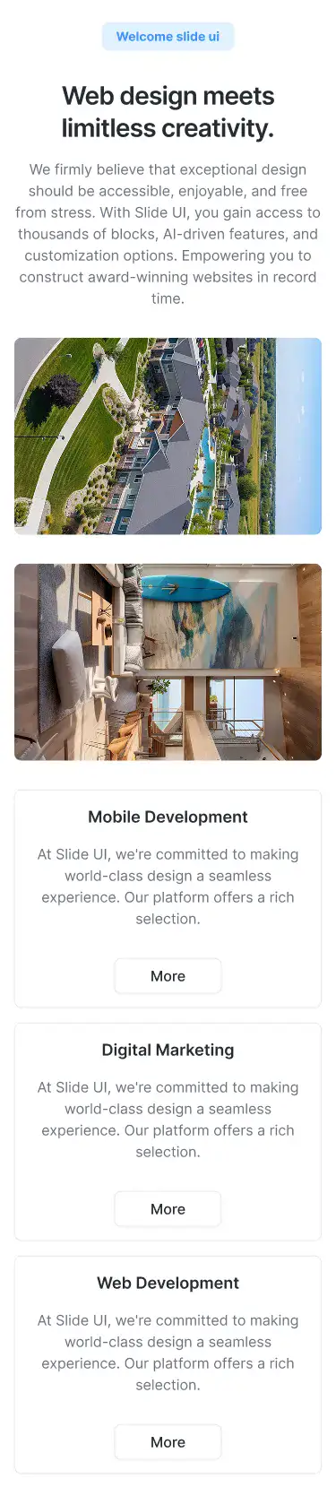 Lightweight sections for storytelling, intros, or visual breaks. Ideal for portfolios, agencies, and SaaS.