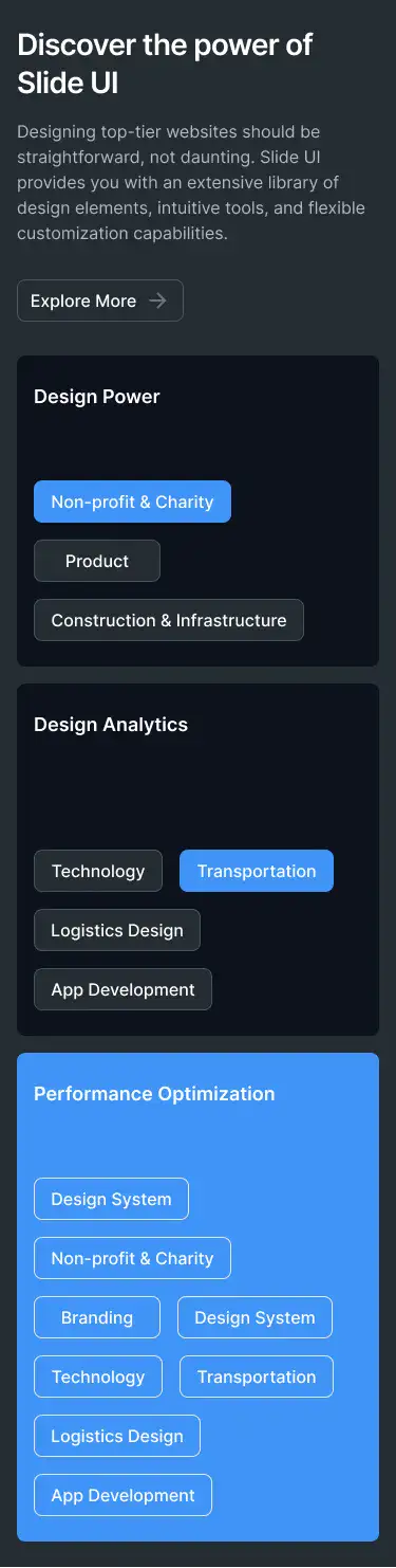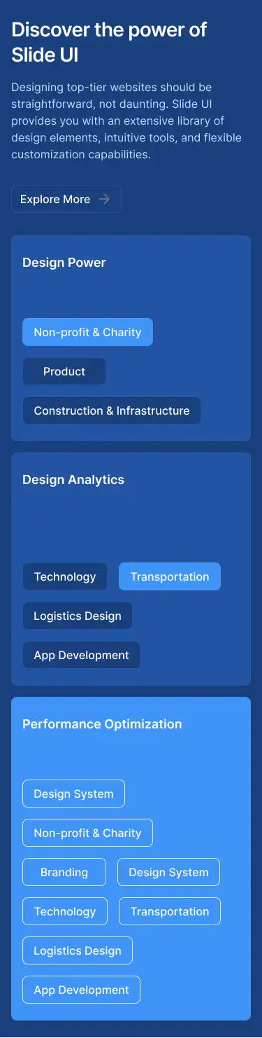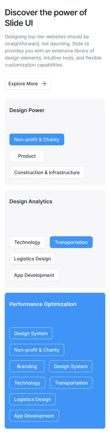 Lightweight sections for storytelling, intros, or visual breaks. Ideal for portfolios, agencies, and SaaS.
