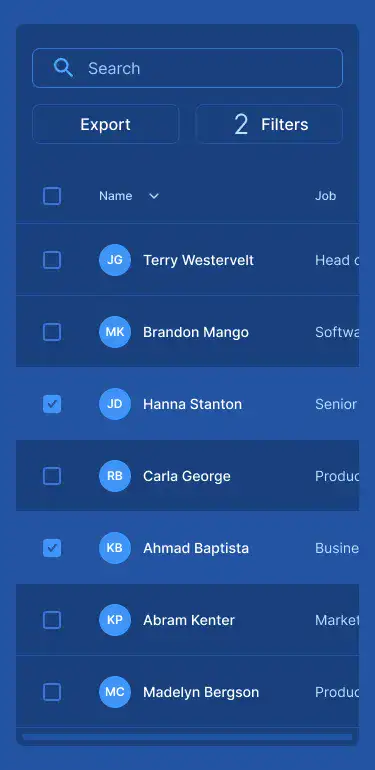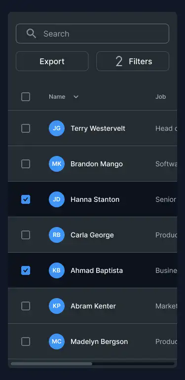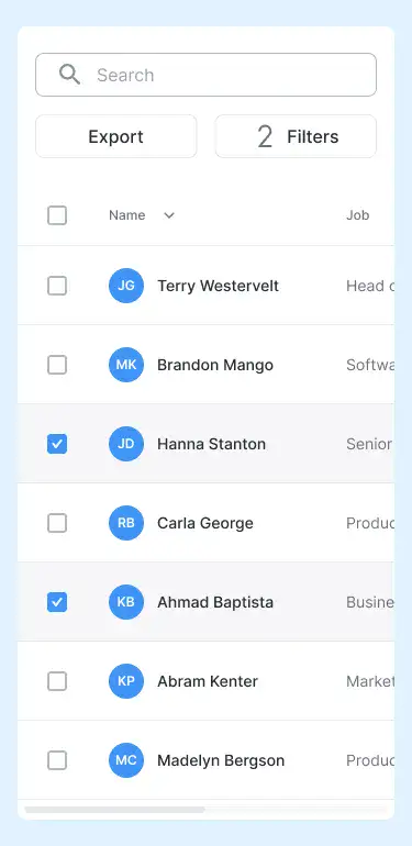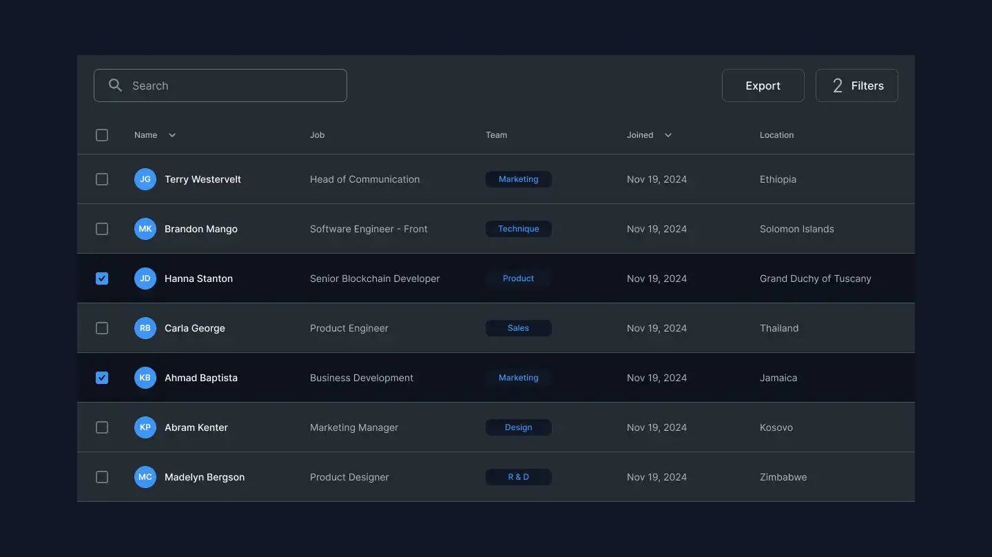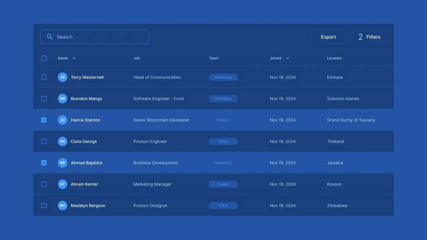 Responsive data table blocks — sortable, readable, and styled for dashboards or admin use.