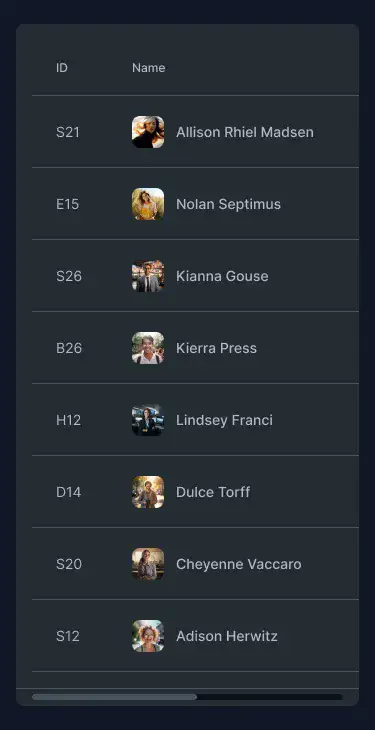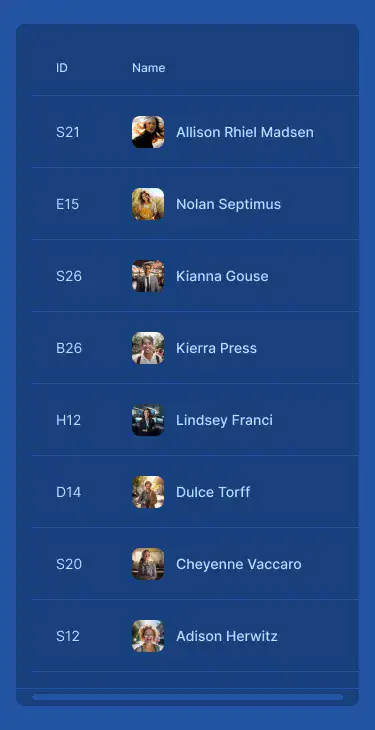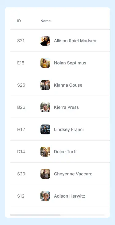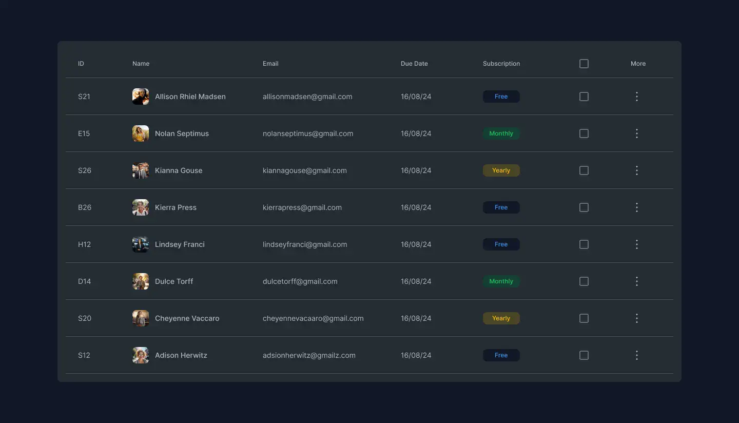 Responsive data table blocks — sortable, readable, and styled for dashboards or admin use.