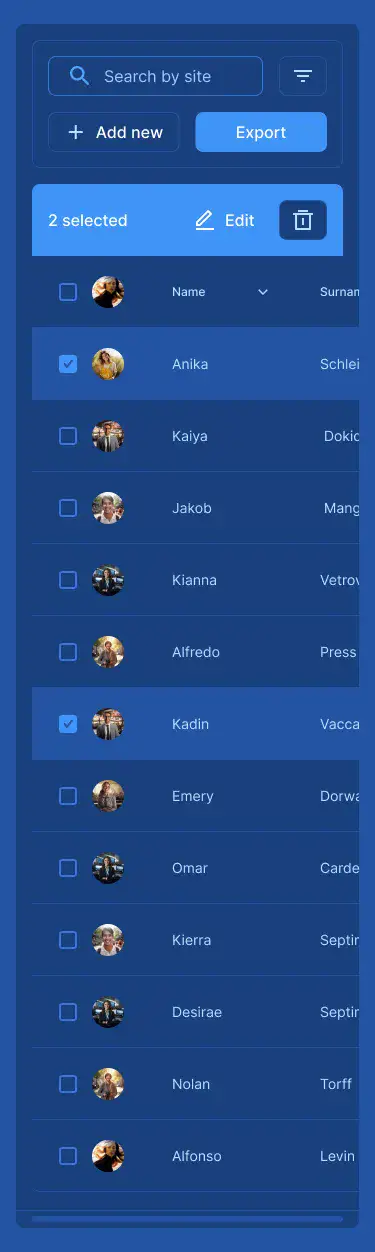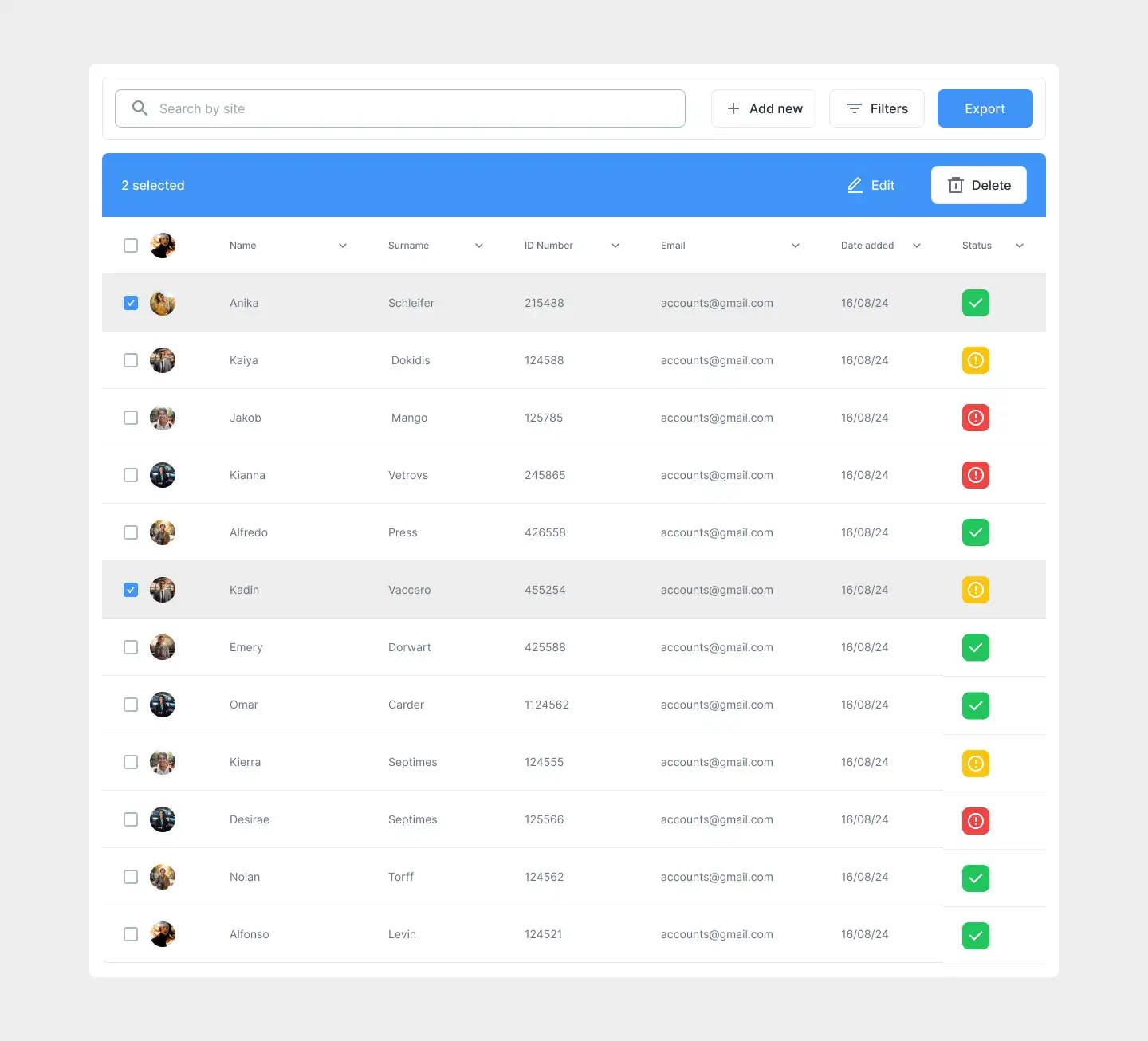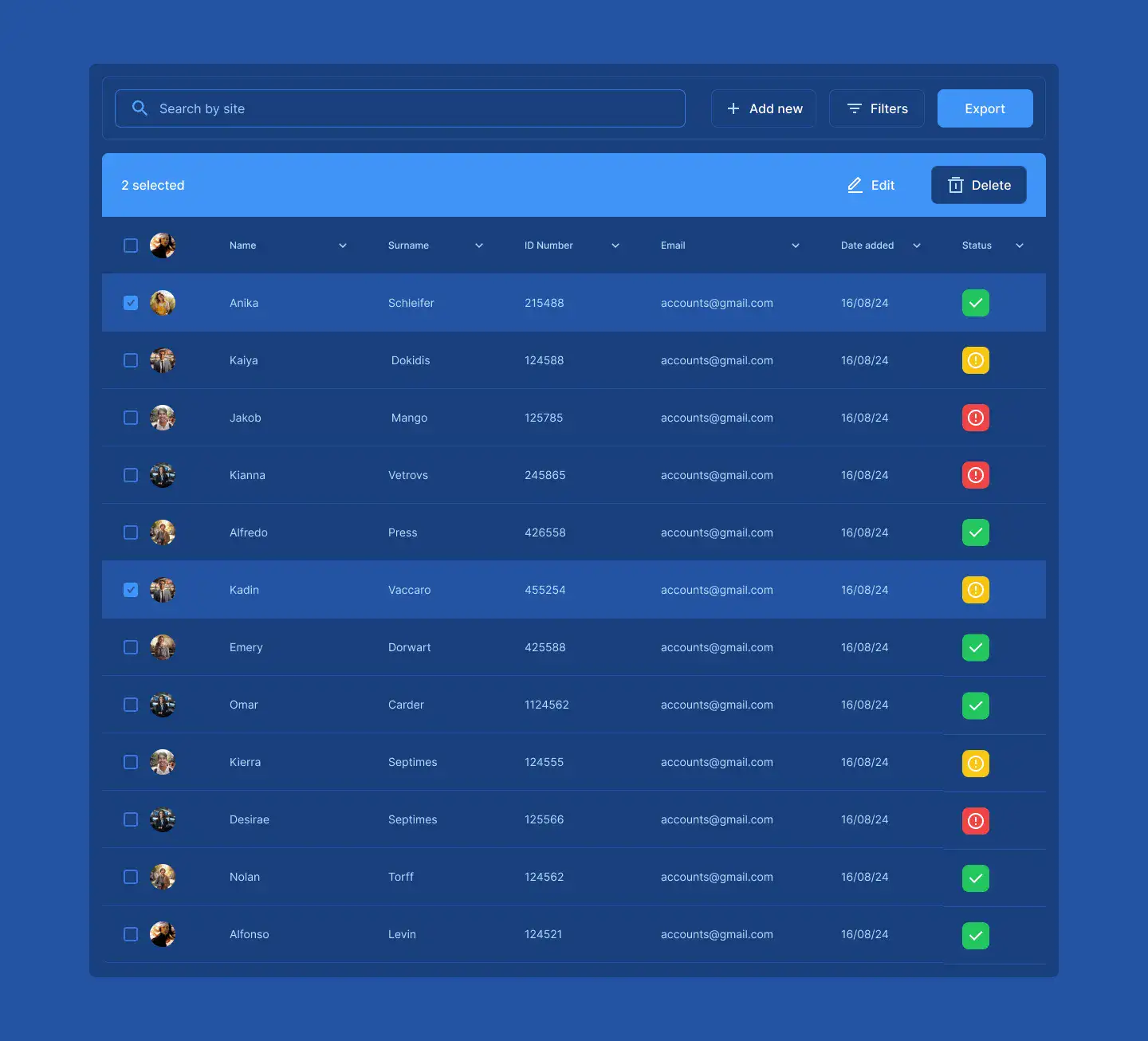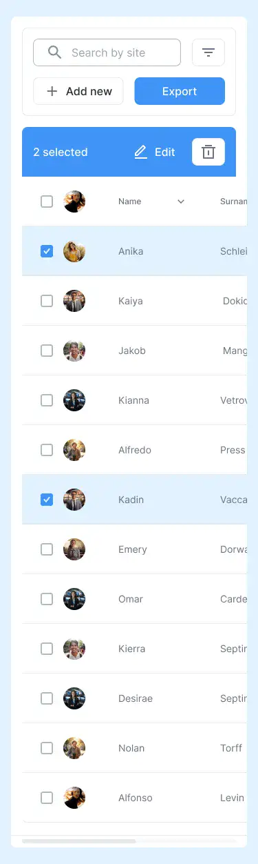 Responsive data table blocks — sortable, readable, and styled for dashboards or admin use.