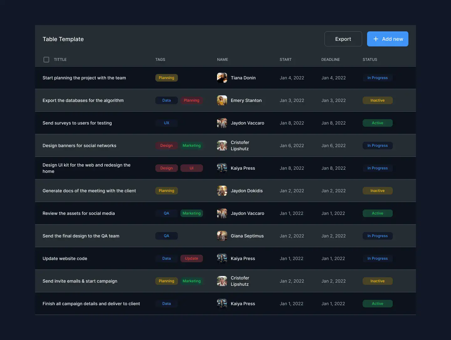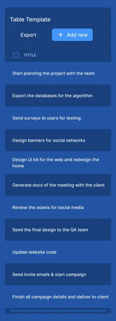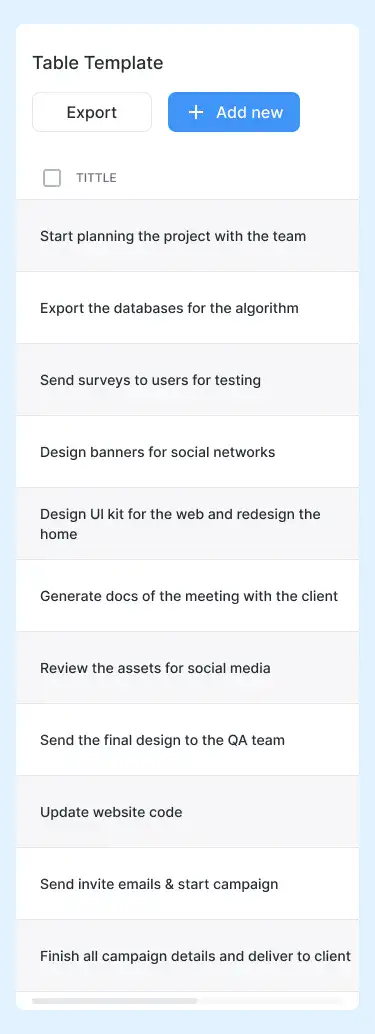 Responsive data table blocks — sortable, readable, and styled for dashboards or admin use.