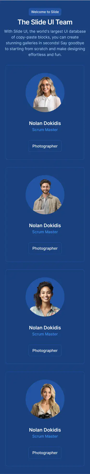 Team Layout for Figma — clean, themeable and responsive across Desktop, Tablet and Mobile. Includes Light, Dark and Accent modes for fast customisation. Ideal for Automotive, Crypto, Ecommerce.