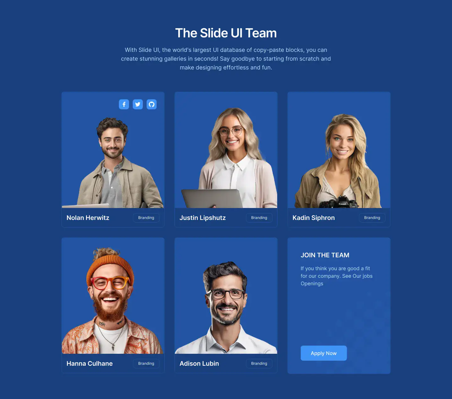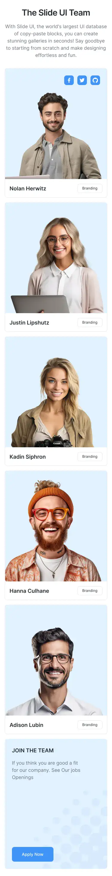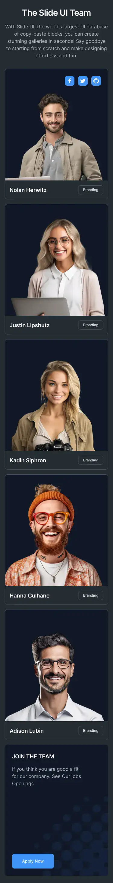 Team Layout for Figma — modern, themeable and responsive across Desktop, Tablet and Mobile. Includes Light, Dark and Accent modes for fast customisation. Ideal for Agency, Crypto, Ecommerce.
