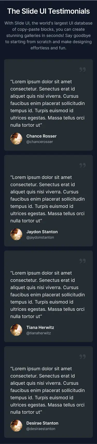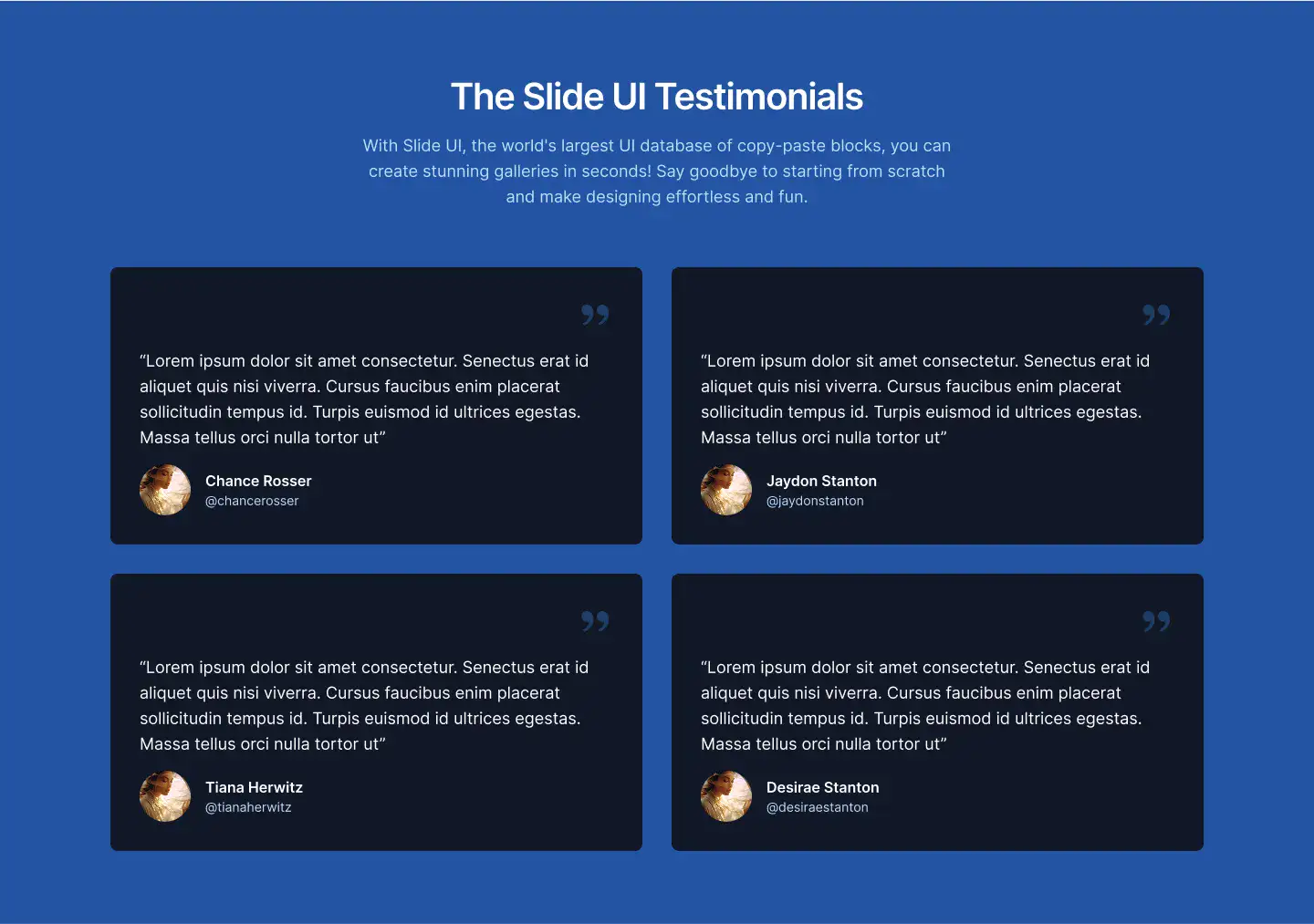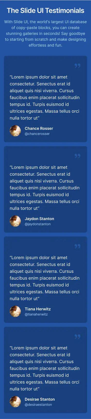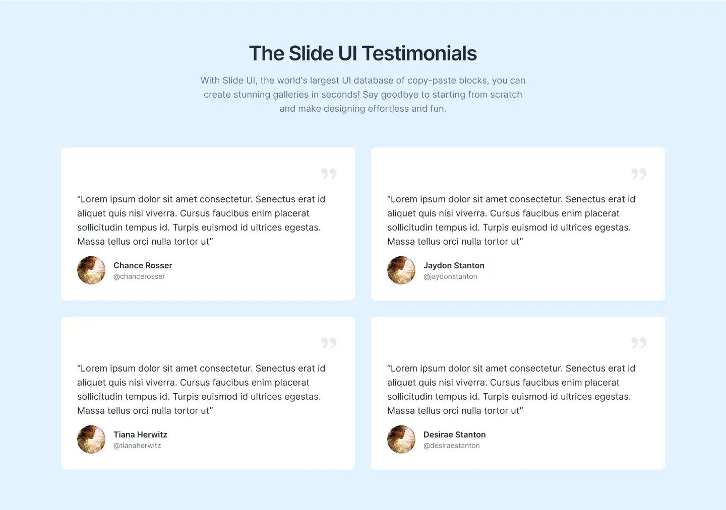 High-trust testimonial sections with avatars, logos, quotes, or carousels. Designed to increase credibility and conversions.