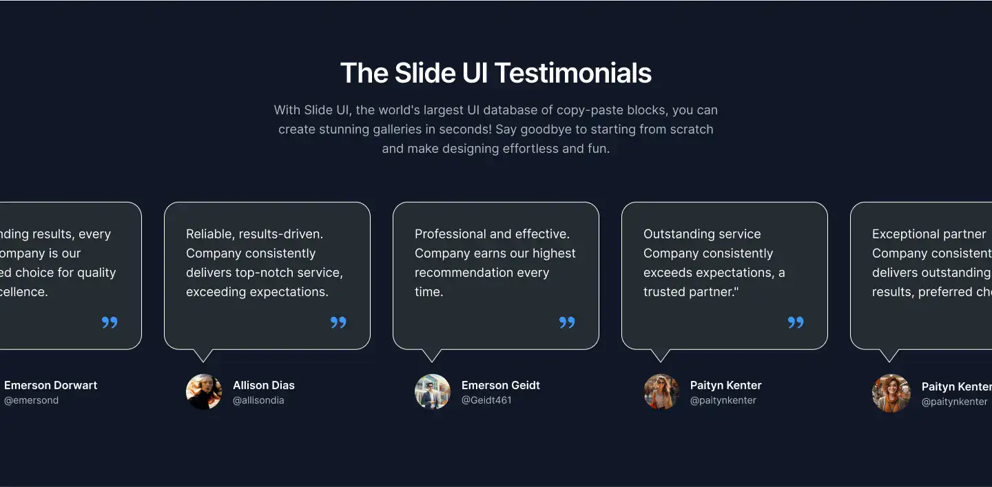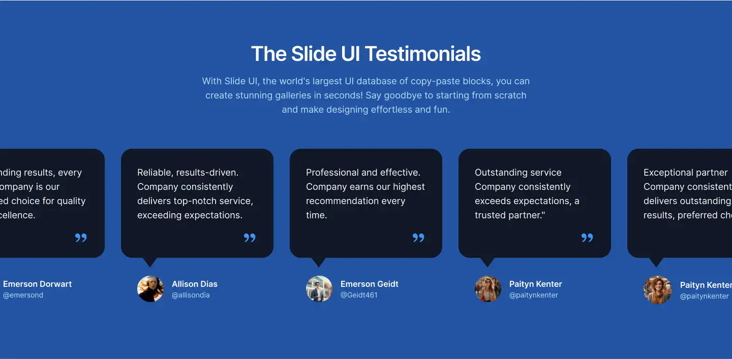 High-trust testimonial sections with avatars, logos, quotes, or carousels. Designed to increase credibility and conversions.
