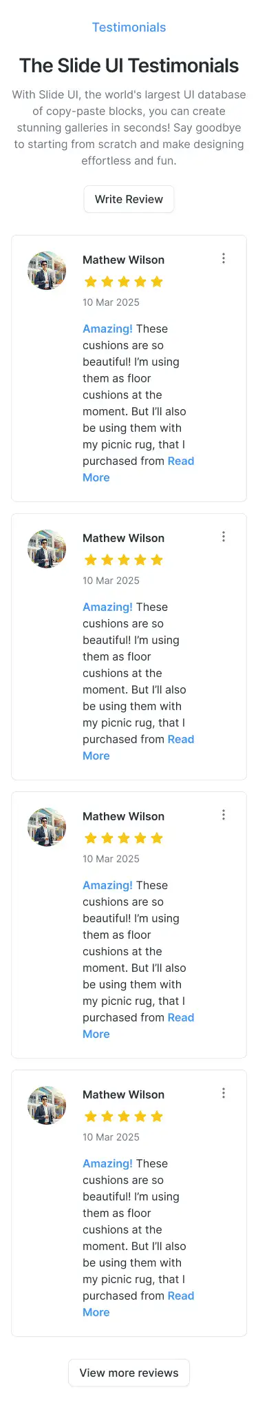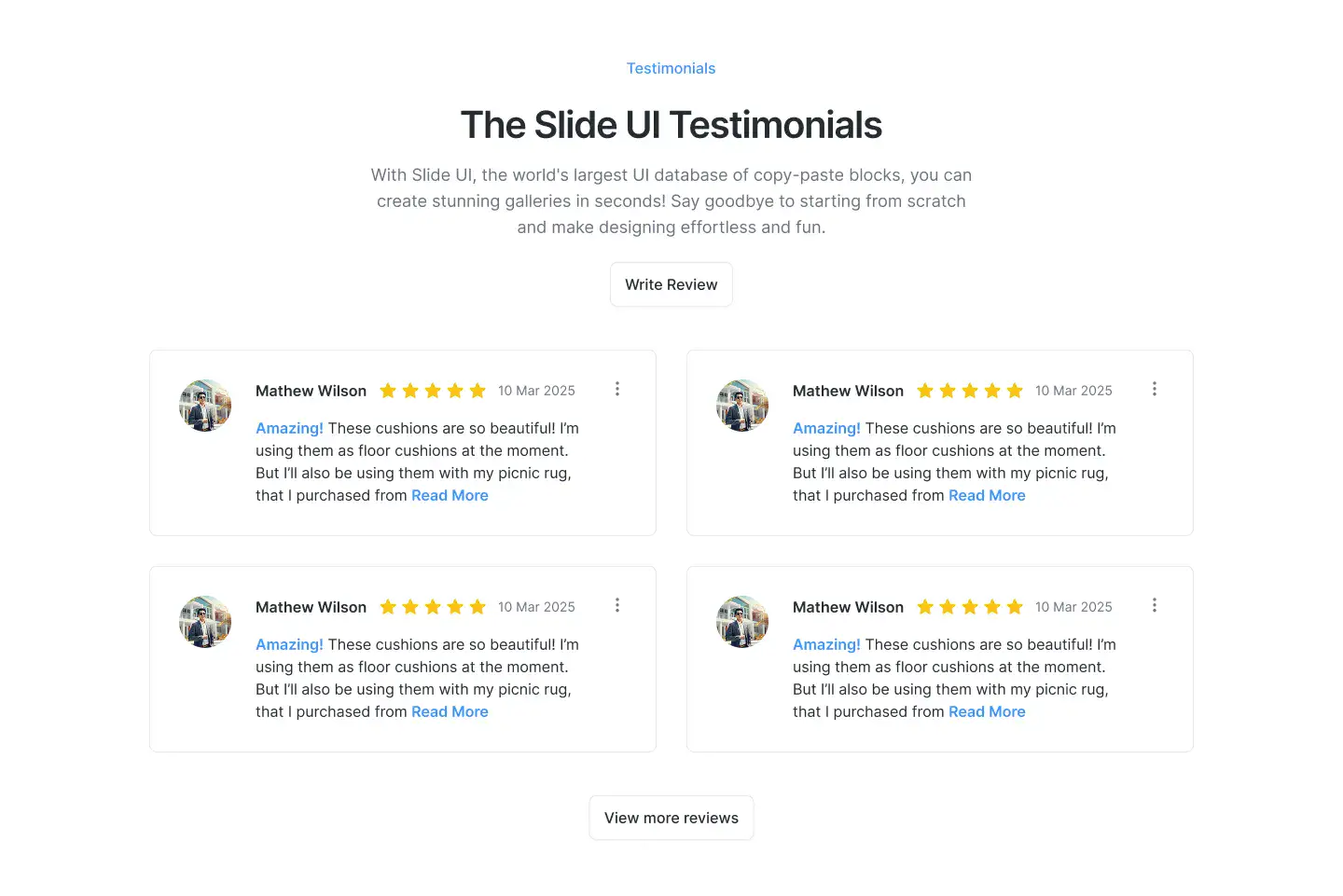 View Testimonial blocksTechnical details, product highlights, feature breakdowns — structured for clarity and mobile responsiveness.
