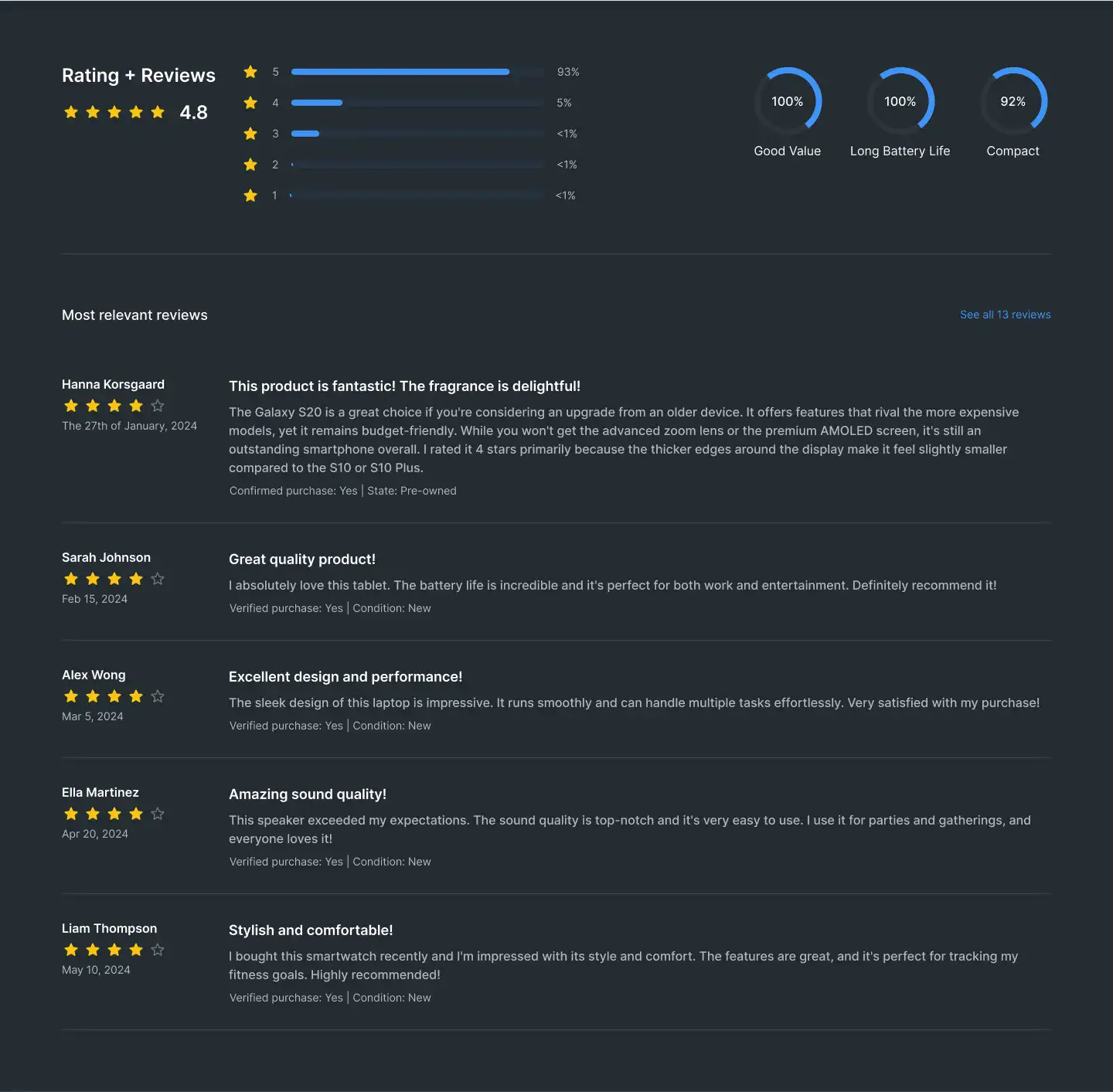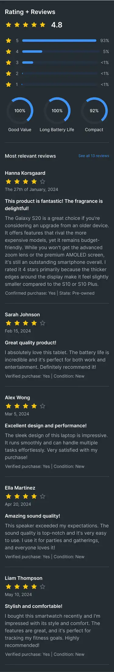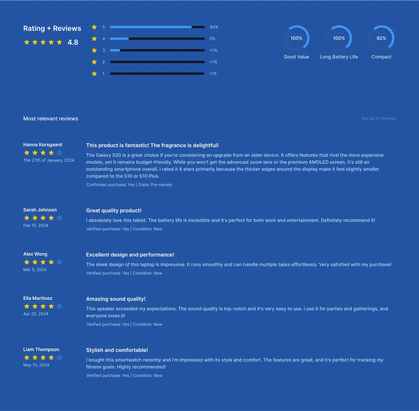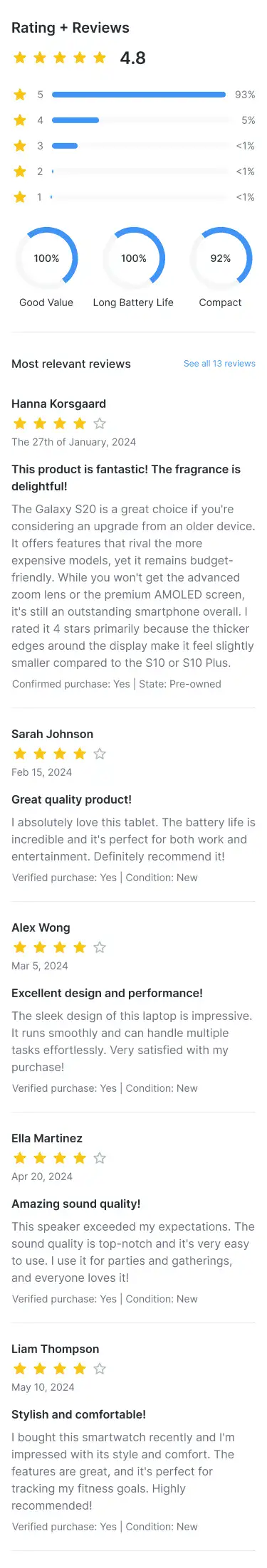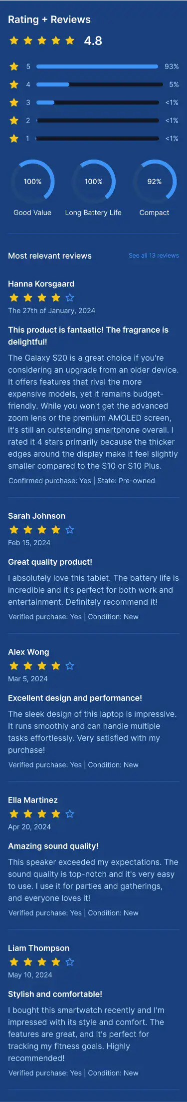 Trust-building review blocks that show user feedback, star ratings, or real testimonials with proof elements.