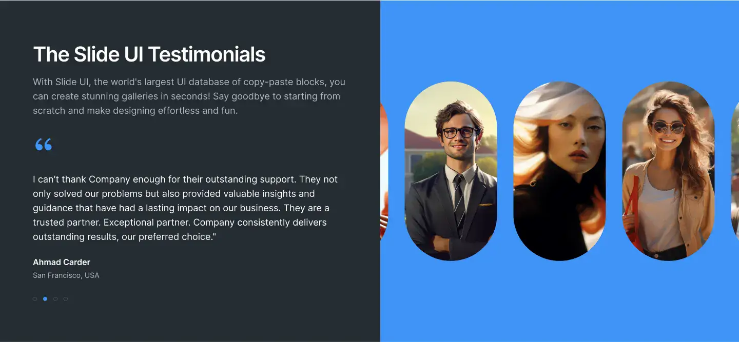 High-trust testimonial sections with avatars, logos, quotes, or carousels. Designed to increase credibility and conversions.
