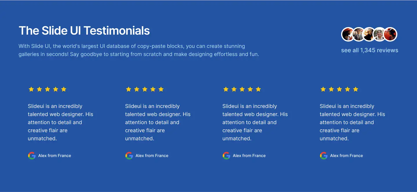 High-trust testimonial sections with avatars, logos, quotes, or carousels. Designed to increase credibility and conversions.