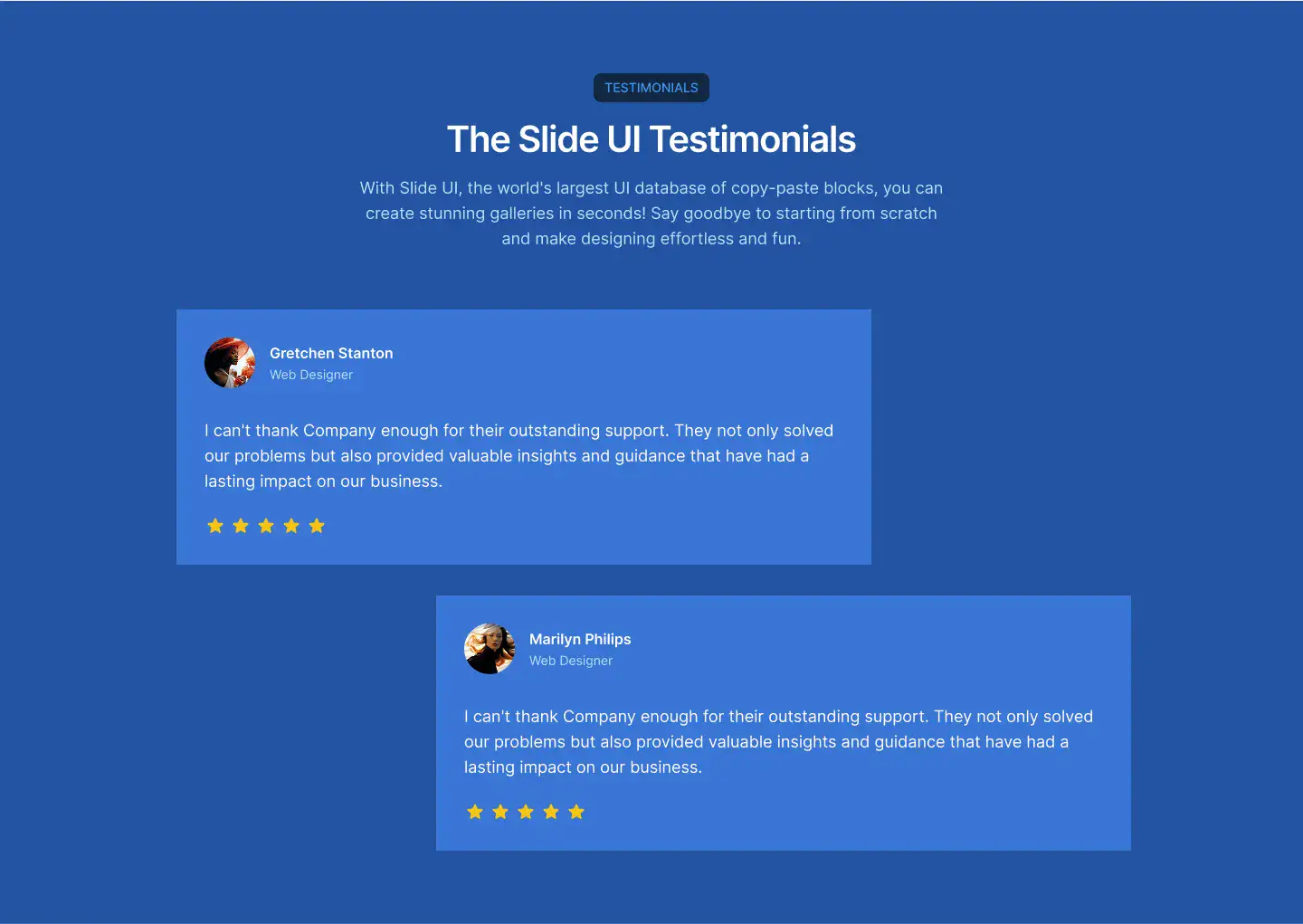 High-trust testimonial sections with avatars, logos, quotes, or carousels. Designed to increase credibility and conversions.
