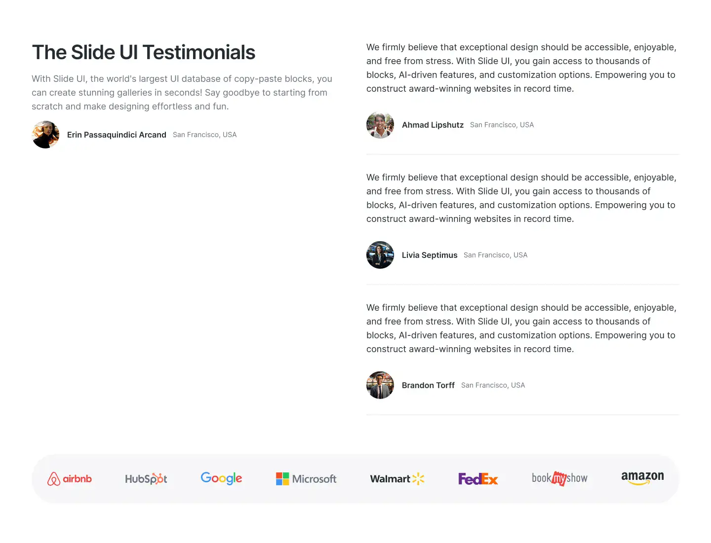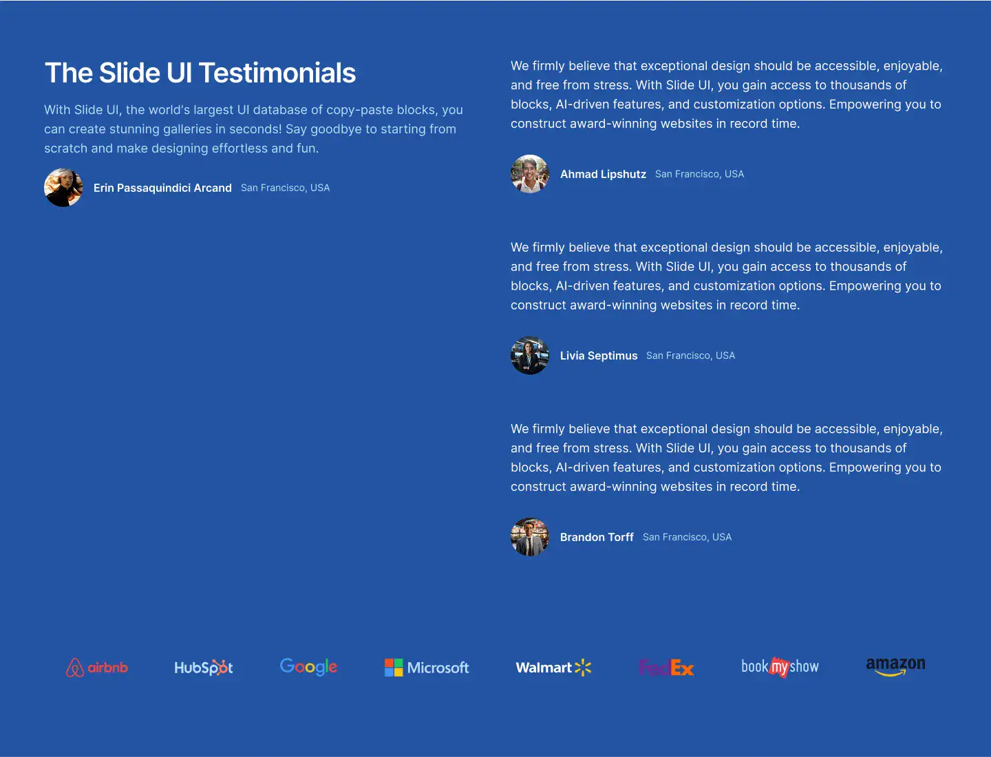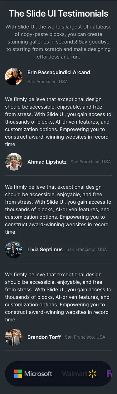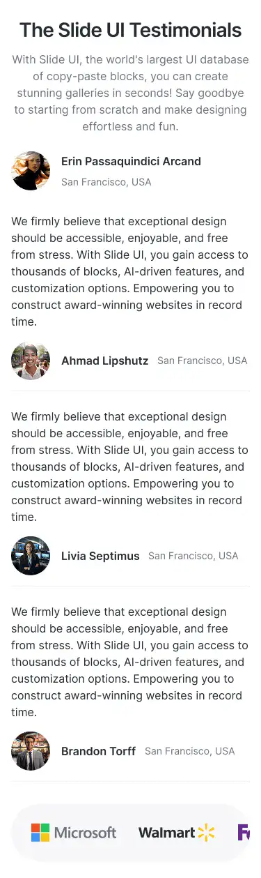 High-trust testimonial sections with avatars, logos, quotes, or carousels. Designed to increase credibility and conversions.