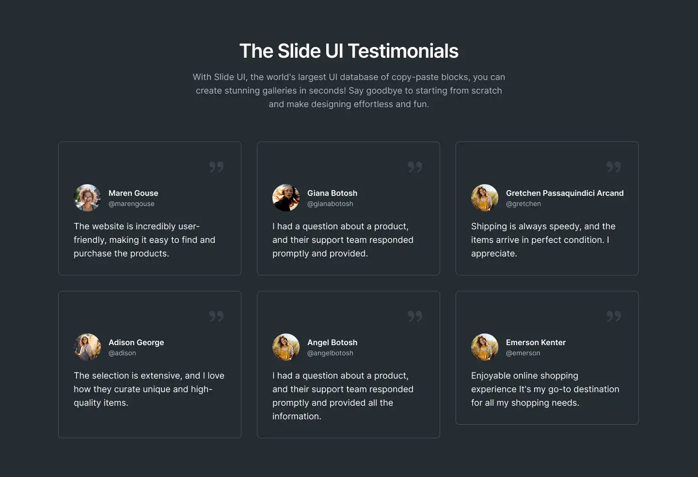 High-trust testimonial sections with avatars, logos, quotes, or carousels. Designed to increase credibility and conversions.