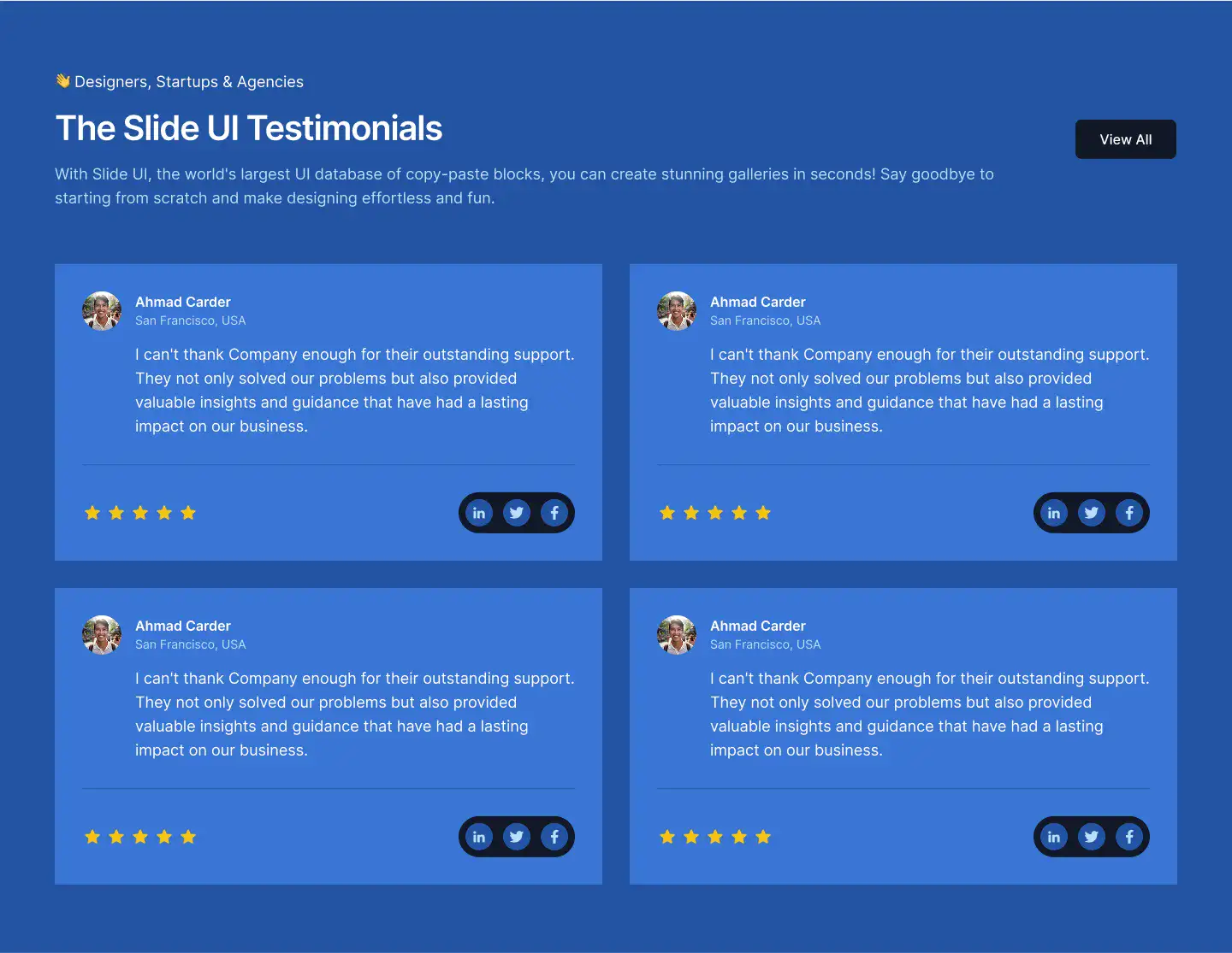 High-trust testimonial sections with avatars, logos, quotes, or carousels. Designed to increase credibility and conversions.