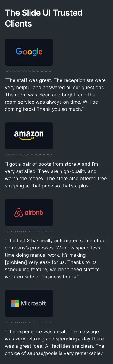 High-trust testimonial sections with avatars, logos, quotes, or carousels. Designed to increase credibility and conversions.