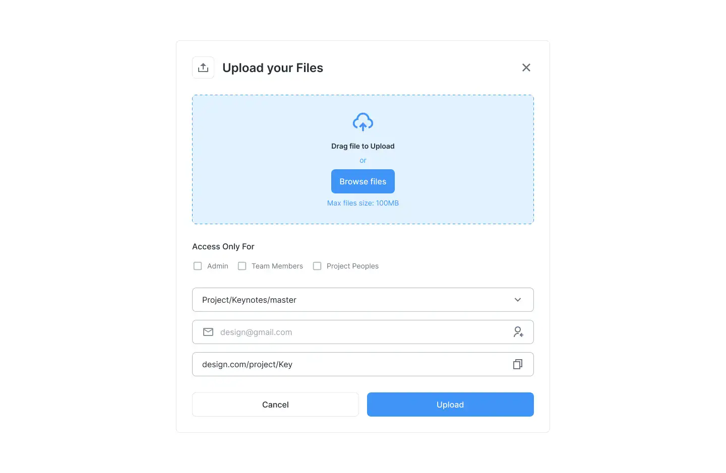 Simple drag-and-drop upload boxes, download areas, or asset release blocks.
