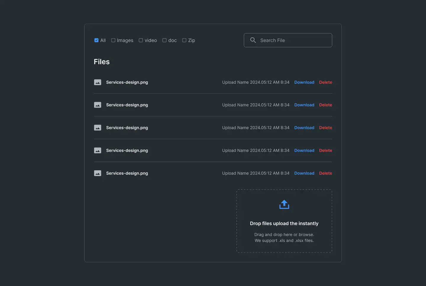 Simple drag-and-drop upload boxes, download areas, or asset release blocks.