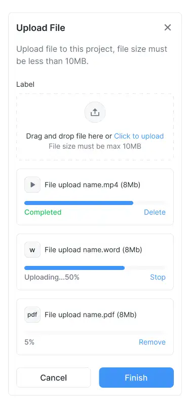 Simple drag-and-drop upload boxes, download areas, or asset release blocks.