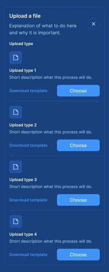 Upload Download Layout for Figma — modern, themeable and responsive across Desktop, Tablet and Mobile. Includes Light, Dark and Accent modes for fast customisation. Ideal for Fintech, Government, Hotel.